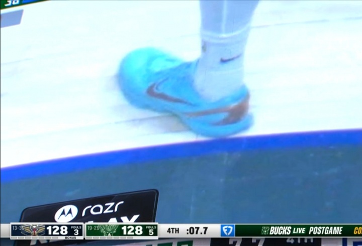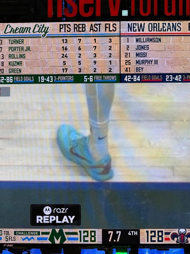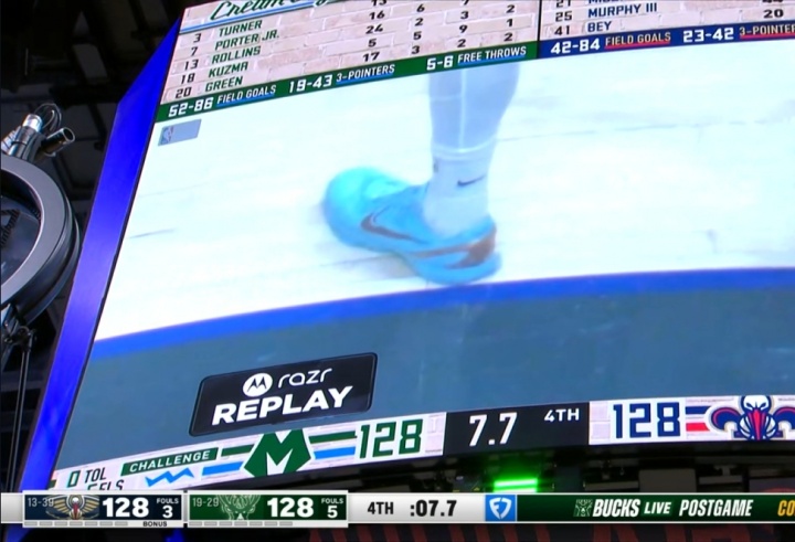 但雄鹿主场大屏幕给了一个视角,好像有一些些的没有踩线,雄鹿全场震惊抗议!