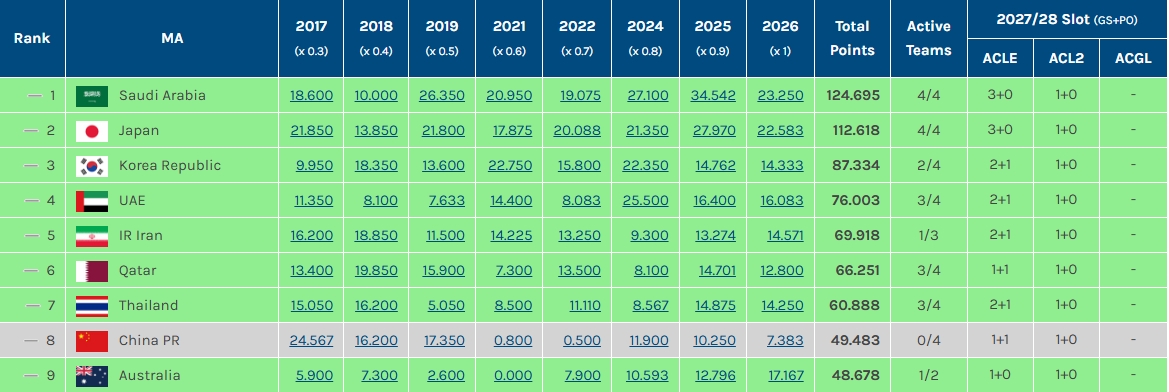 因此中超球队得以在27-28赛季保留三个亚冠席位,澳超球队则还是1个亚冠精英联赛正赛+1个亚冠二级联赛正赛席位。